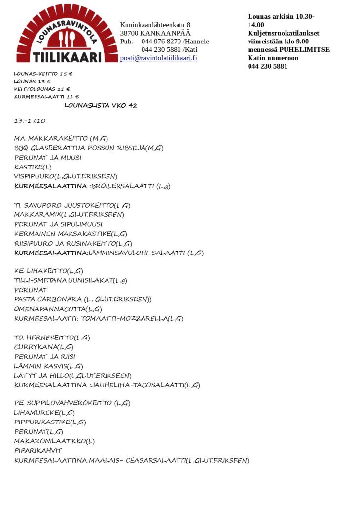 Tarjoamme lounasta arkipäivisin klo 10.30-14. Meillä voit nauttia keittolounaan 11€, sisältäen runsaan salaattipöydän, leivät, ruokajuomat, jälkiruoan ja kahvin. Lounaaseen 13€ saat pääruoan lisäkkeineen. Kovempaan nälkään lounas 15€ sisältyy pääruoan lisäksi keitto. Kevyempi vaihtoehto on kurmeesalaatti 11€, johon kuuluu myös leivät, ruokajuomat, jälkiruoka sekä kahvi.