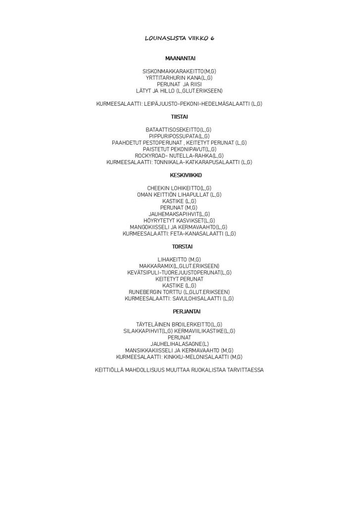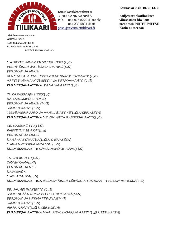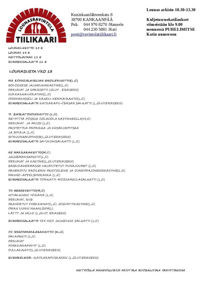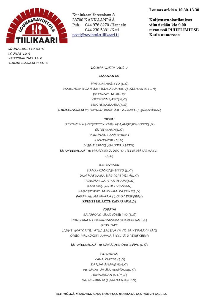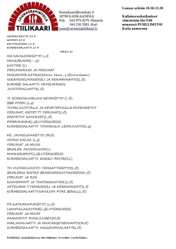Tarjoamme lounasta arkipäivisin klo 10.30-13.30. Meillä voit nauttia keittolounaan 11€, sisältäen runsaan salaattipöydän, leivät, ruokajuomat, jälkiruoan ja kahvin. Lounaaseen 13€ saat pääruoan lisäkkeineen. Kovempaan nälkään lounas 15€ sisältyy pääruoan lisäksi keitto. Kevyempi vaihtoehto on kurmeesalaatti 11€, johon kuuluu myös leivät, ruokajuomat, jälkiruoka sekä kahvi.