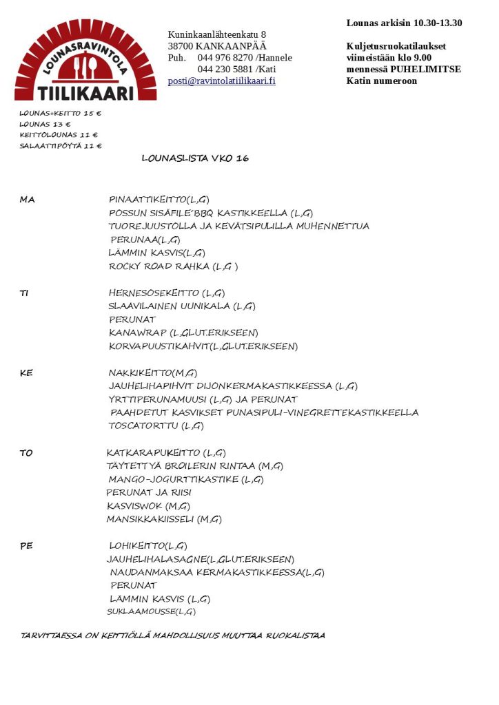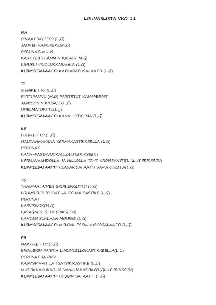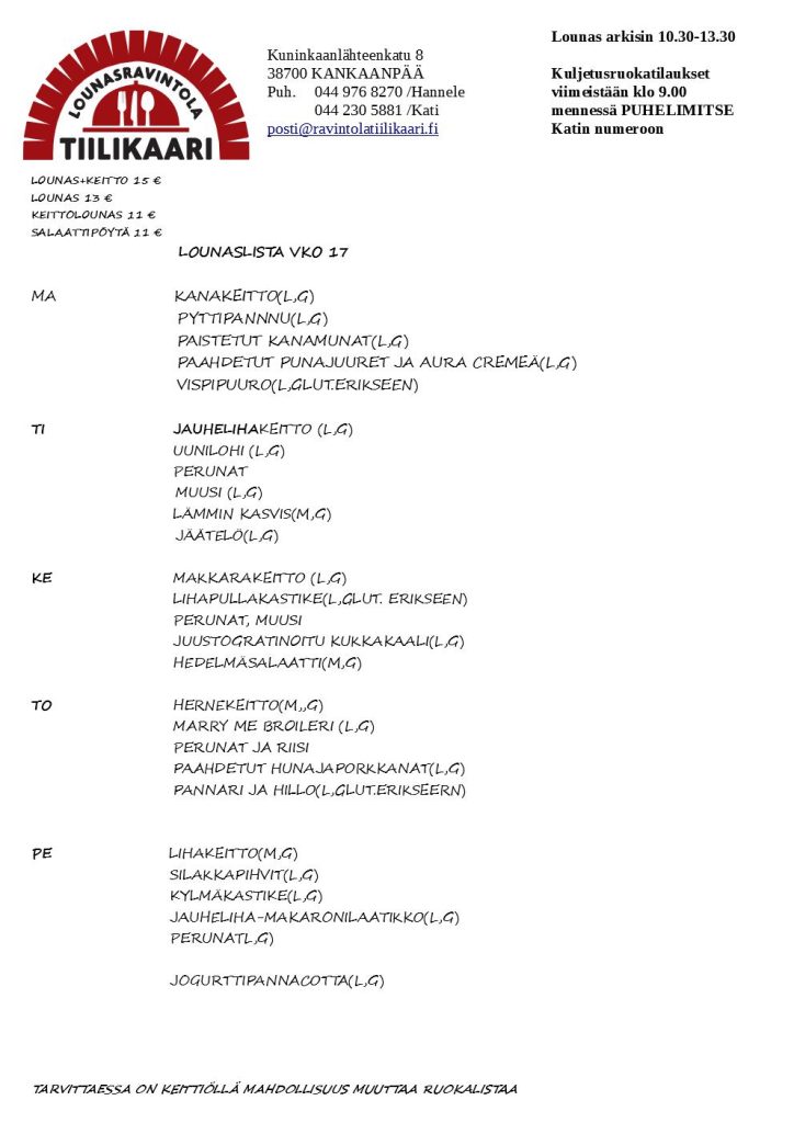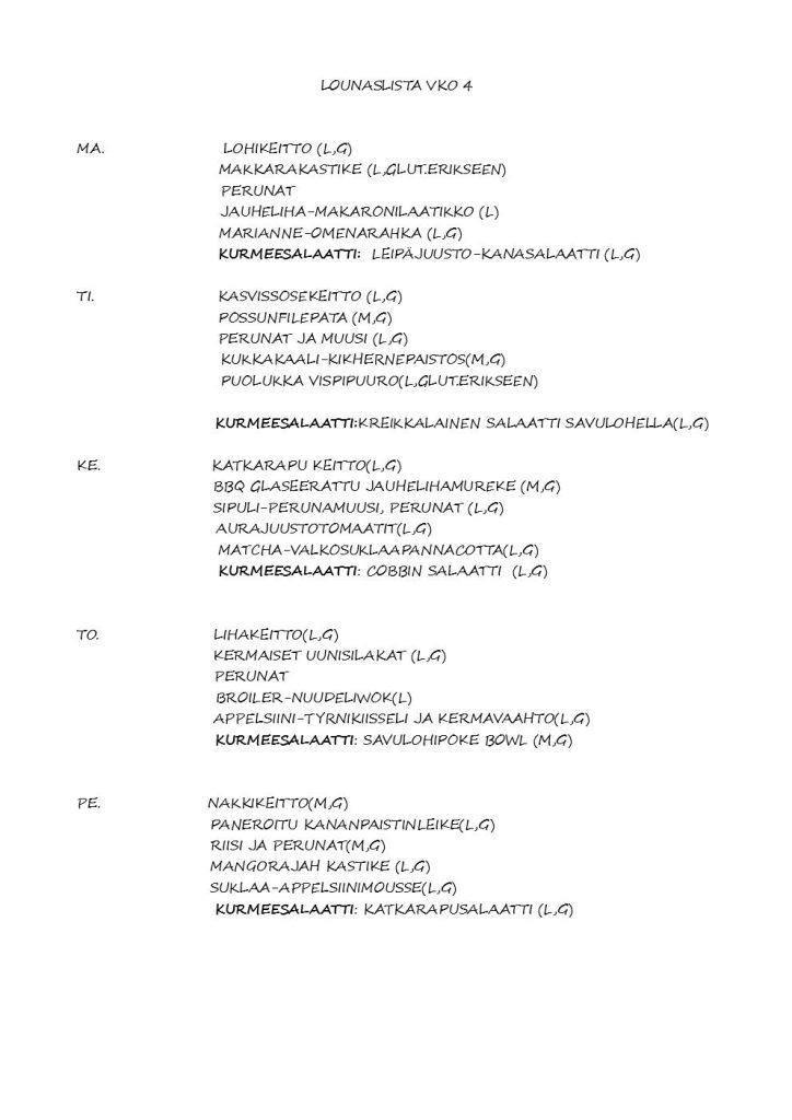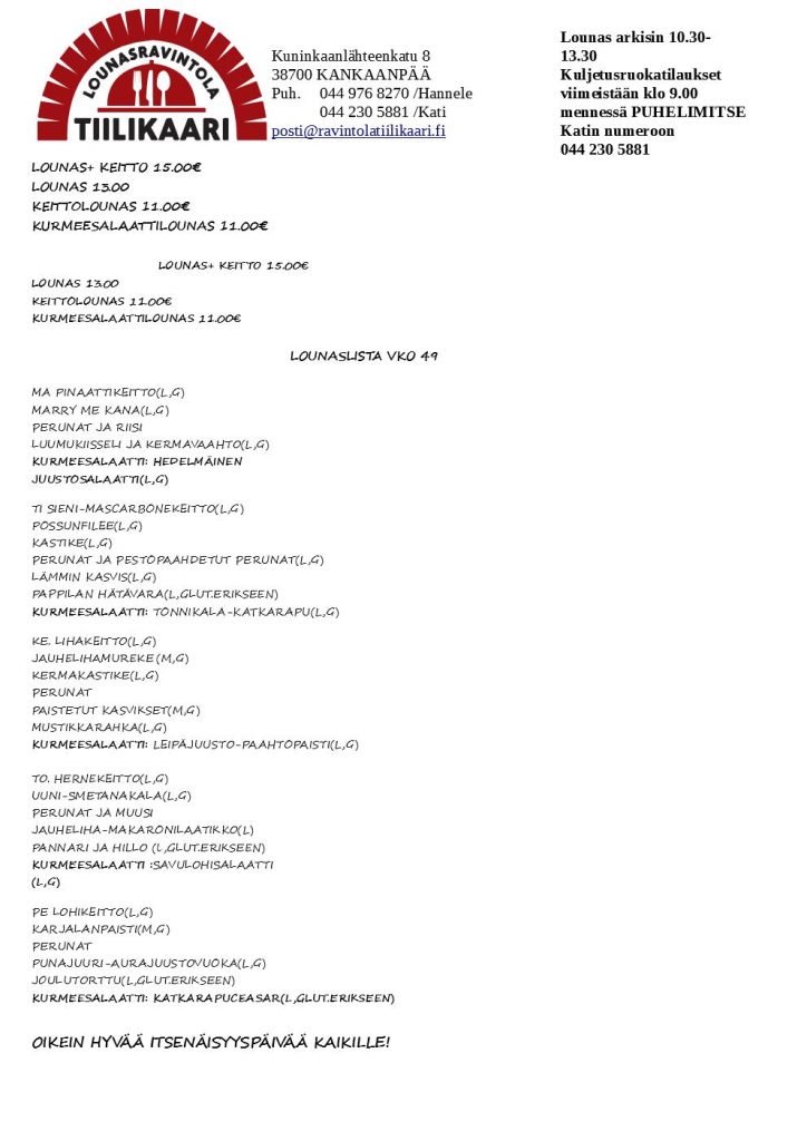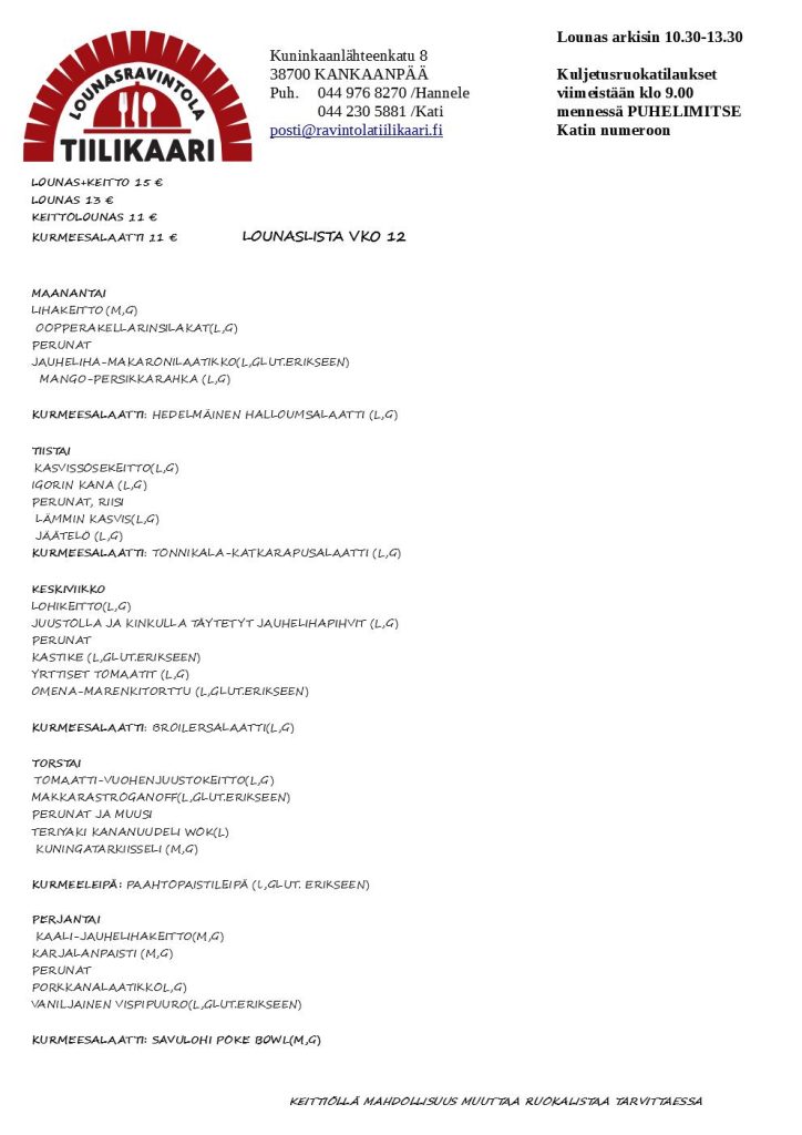 Tarjoamme lounasta arkipäivisin klo 10.30-13.30. Meillä voit nauttia keittolounaan 11€, sisältäen runsaan salaattipöydän, leivät, ruokajuomat, jälkiruoan ja kahvin. Lounaaseen 13€ saat pääruoan lisäkkeineen. Kovempaan nälkään lounas 15€ sisältyy pääruoan lisäksi keitto. Kevyempi vaihtoehto on kurmeesalaatti 11€, johon kuuluu myös leivät, ruokajuomat, jälkiruoka sekä kahvi.